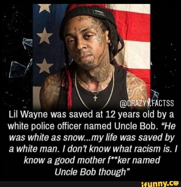 (x-post from /r/til) The Cop that saved Lil' Wayne's life ... (x-post from /r/til) The Cop that saved Lil' Wayne's life at the age of 12 was called "Uncle Bob" Close. 4. Posted by 5 years ago. Archived (x-post from /r/til) The Cop that saved Lil' Wayne's life at the age of 12 was called "Uncle Bob" Is Lil' Wayne the future leader of the human resistance against the machines? 1 comment.